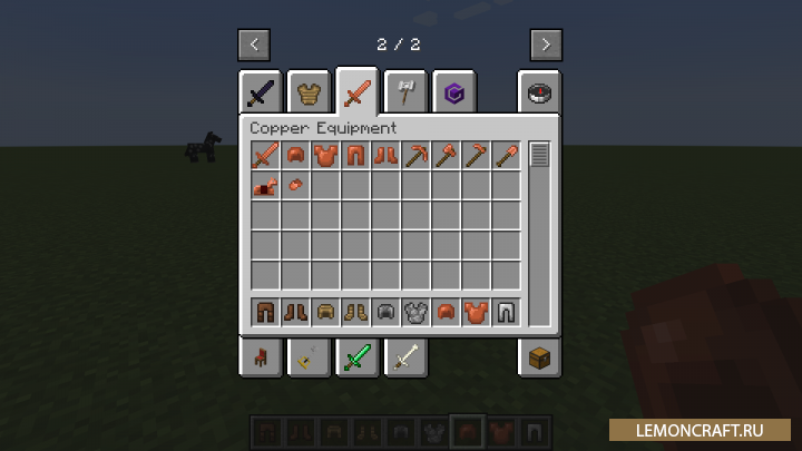 Мод на оборудование из меди Copper Equipment небольшая модификация добавляющая в игру инструменты и броню изготовленные из меди. Броня из данного материала будет лучше кожаной, а инструменты менее прочными чем каменные, но при этом более быстрые.